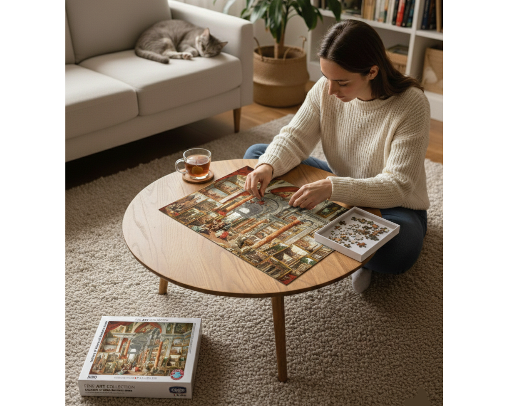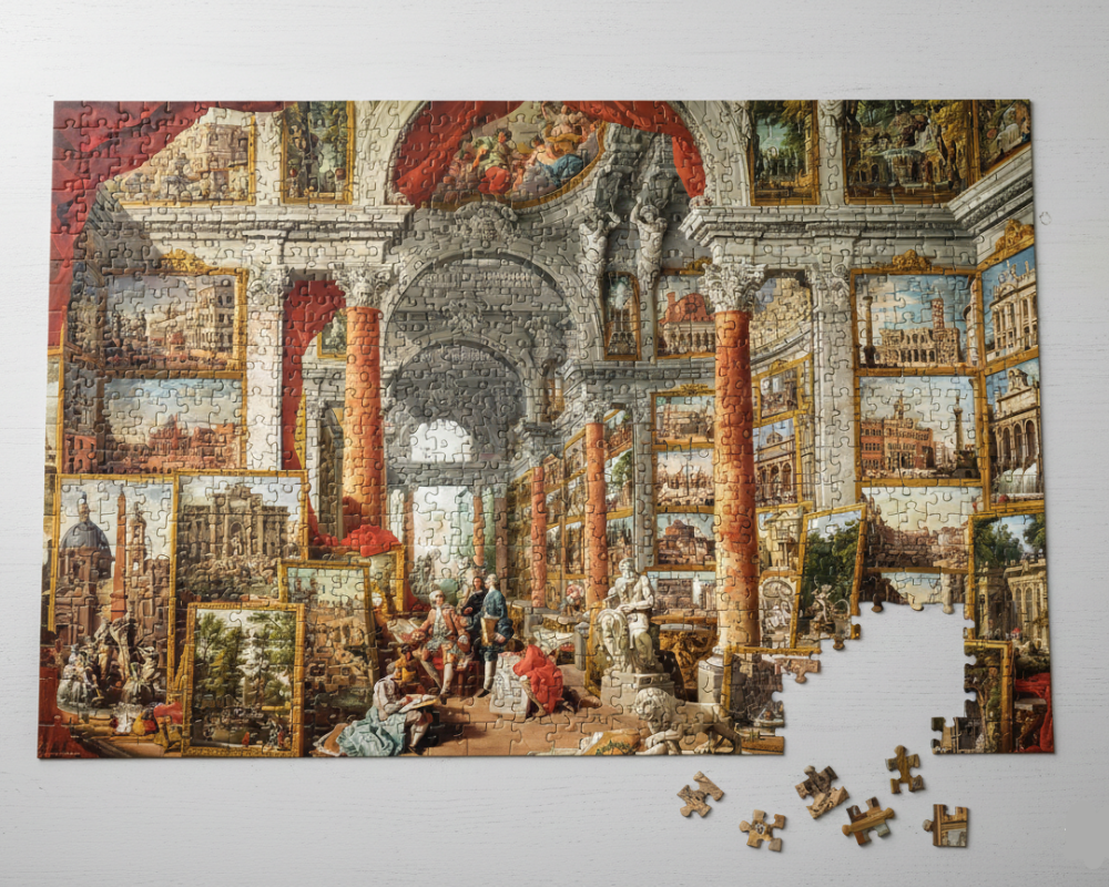 Descubre la sofisticación y el esplendor del arte clásico con este espectacular rompecabezas de 1000 piezas titulado "Galería de Vistas de Roma Moderna". La imagen muestra la célebre obra del maestro Giovanni Paolo Panini que captura las plazas, fuentes y monumentos más emblemáticos de la Roma del siglo XVIII en una sola composición monumental.