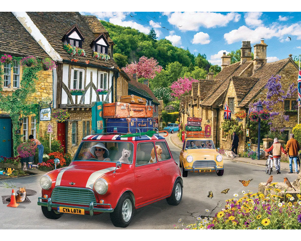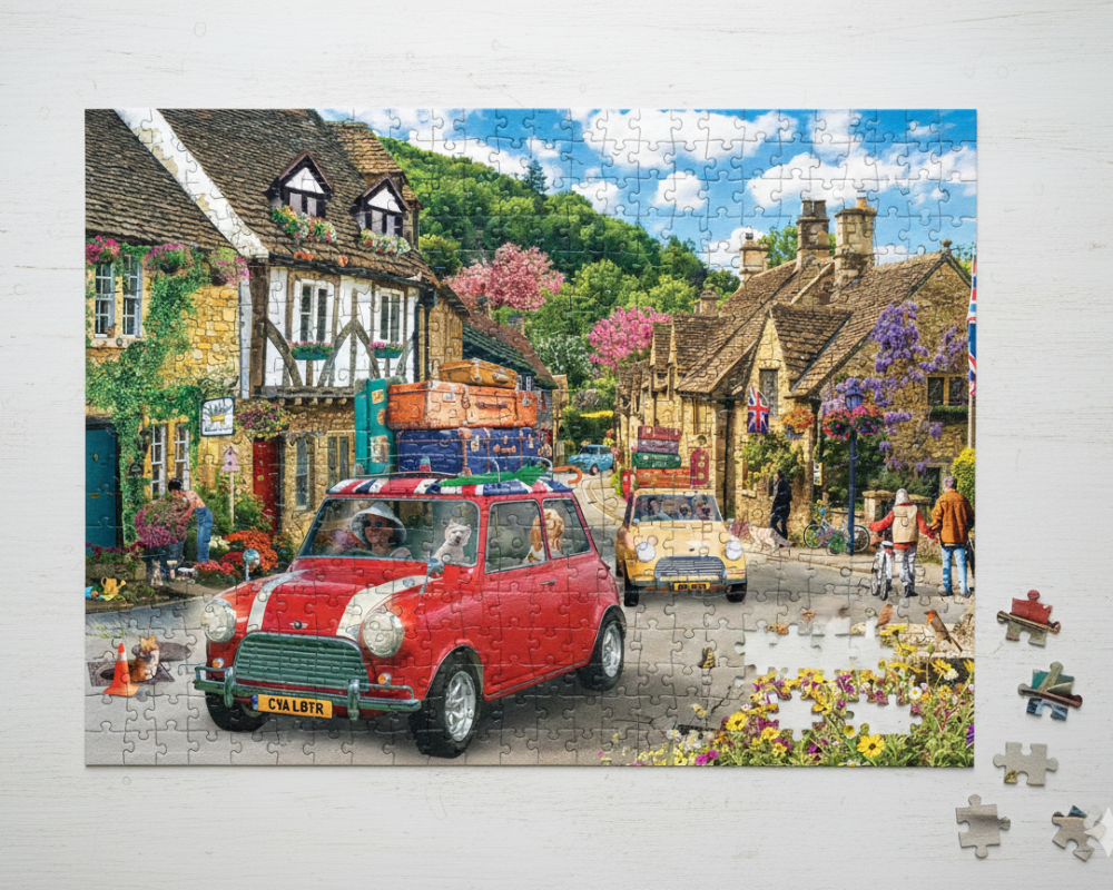 Descubre la alegría de viajar y el encanto retro con este vibrante rompecabezas de 1000 piezas titulado "Mini Cooper". La imagen, creada por la artista L. Kate, nos transporta a una pintoresca villa europea donde icónicos autos clásicos, cargados con maletas coloridas y acompañados por simpáticos perritos, se preparan para una gran aventura.
