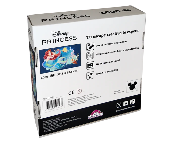 Sumérgete en el mundo marino de Ariel junto a Flounder y Sebastián con este rompecabezas de 1000 piezas de plástico resistente, impresas en alta definición para capturar cada detalle de la mágica vida bajo el mar.